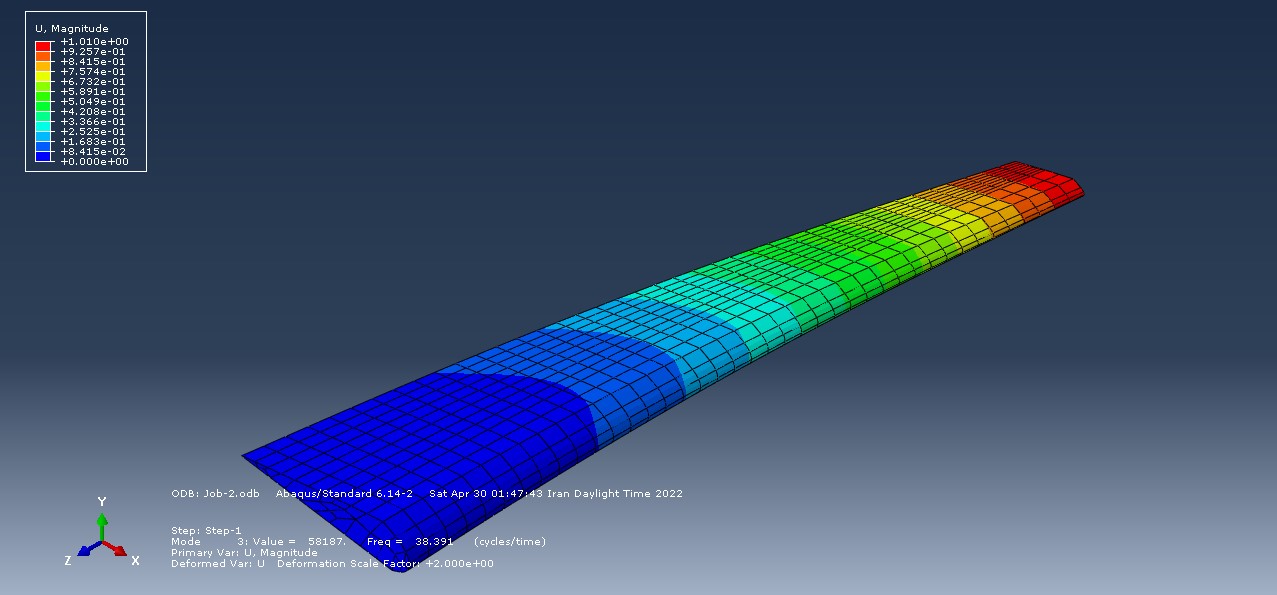 فرکانس طبیعی و شکل حالت بال هواپیما با در نظر گرفتن بال به عنوان یک پرتوی کنسول به دست آمد. مدل بال در نرم افزار آباکوس ایجاد شد. سپس مدل با اعمال شرایط مرزی مناسب برای انجام تحلیلهای مودال عددی در نرم افزار آباکوس شبیهسازی شد. نتایج تحلیل مودال عددی مشخص شد که حداکثر تغییر شکل مربوط به فرکانس مد چهارم، فرکانس ۶۸٫۴۷۶ هرتز است که می تواند به عنوان فرکانس طراحی سازه بال در نظر گرفته شود. با این حال فرکانس طبیعی اصلی ساختار بال ۷٫۷۴۳۱ هرتز برای مد اول است.